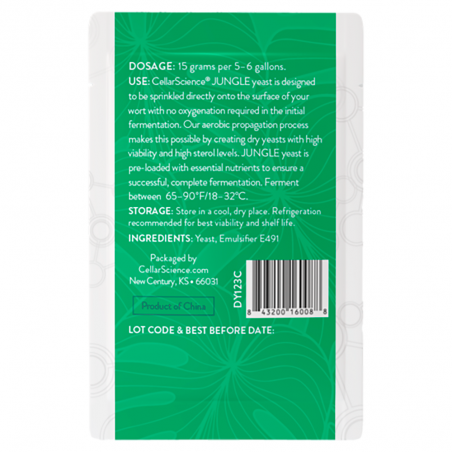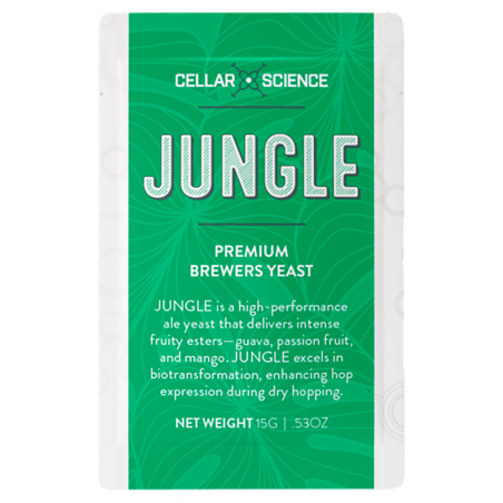 JUNGLE es una cepa de levadura ale de alto rendimiento que se especializa en ésteres frutales masivos. Produce un aroma distintivo de guayaba, maracuyá y mango. Esta cepa sobresale en la biotransformación, mejorando el carácter del lúpulo cuando se combina con grandes adiciones de Dry Hopping; selecciona una variedad de lúpulo afrutado para maximizar su potencial. JUNGLE prospera en un amplio rango de temperaturas de fermentación, lo que garantiza un riesgo mínimo de sabores desagradables incluso a altas temperaturas o con fluctuaciones de temperatura. También es extremadamente robusta, capaz de tolerar niveles de alcohol de hasta 15% ABV y fermentar bajo presión de hasta 12 PSI. Con una maduración acelerada, JUNGLE ofrece una cerveza bebible en solo unos días, lo que la convierte en una opción ideal tanto para profesionales como para cerveceros caseros.