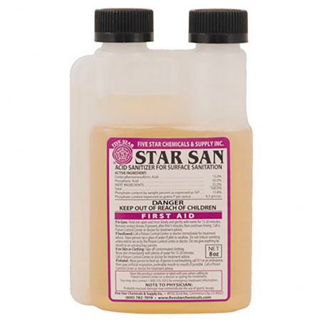 Star San es un desinfectante a base de ácido que es rápido, inodoro, insípido y seguro para la mayoría de los materiales, excepto los metales más blandos. Como espumante alto, su acción espumante asegura la cobertura y el tiempo de contacto en los recipientes más grandes y una mejor penetración en los rincones y grietas. Cualquier espuma que quede en tu garrafón o barril no dañará tu cerveza ni a ti. Si planea preparar un poco para la aplicación en rociado, es mejor usar agua destilada o de ósmosis inversa para maximizar la vida útil de la porción no utilizada (los minerales en el agua del grifo reducen la vida útil de Star San una vez en solución). Use 28 gramos por 19 litros de agua. Tiempo de contacto de 1 minuto. Completamente seguro y no tóxico. No impartirá sabores ni olores.